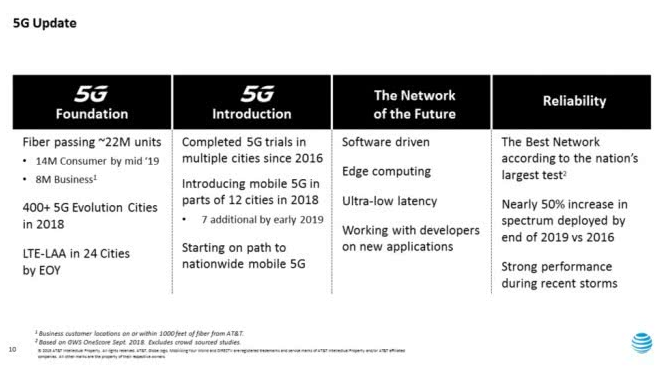 至于大家关心的5G移动宽带网速,AT&T表示最高峰值可以达到为1GB/s,平均速度不低于300MB/s,延迟可控制在1毫秒内,这是在之前光纤网络上扩建而来,所以今年年底前,AT&T要把光纤网络覆盖超过1800万个客户场所,明年这个覆盖数字超过2200万,没有覆盖的地方,将考虑租用其他服务商的光纤网络。