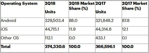 在智能手机操作系统(OS)市场,谷歌的Android在2018年第二季度进一步扩大其市场领先地位,占有88%的市场份额,苹果iOS的市场份额仅11.9%(见表2)。