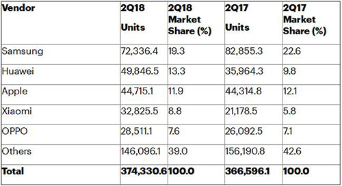 三星保持全球智能手机供应商排名第一的地位,2018年第二季度下降12.7%(见表1)。“三星面临着全球智能手机需求放缓以及中国制造商日益激烈的竞争,”古普塔先生说。“对其旗舰智能手机的需求放缓导致三星的盈利能力下降。现在预计Note 9智能手机将恢复增长。”