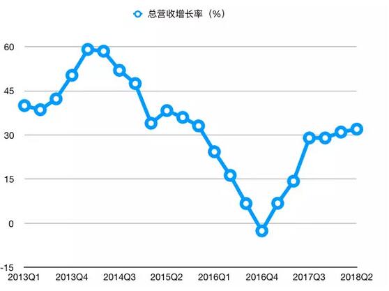 百度刚刚发布了2018年二季度财报,看上去很“亮眼”:今年连续两个季度实现超过30%的总营收增长率(2018Q1营收同比增长31%,Q2同比增长32%)。