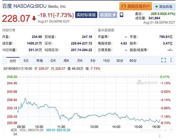 谷歌预计推出中国版搜索安卓App的消息传出,百度股价第一个慌了:盘前股价下跌19.37美元,跌至 227.81 美元,跌幅达7.84%。截止8 月1日,百度收盘价为 228.07美元,市值跌破800亿美元。