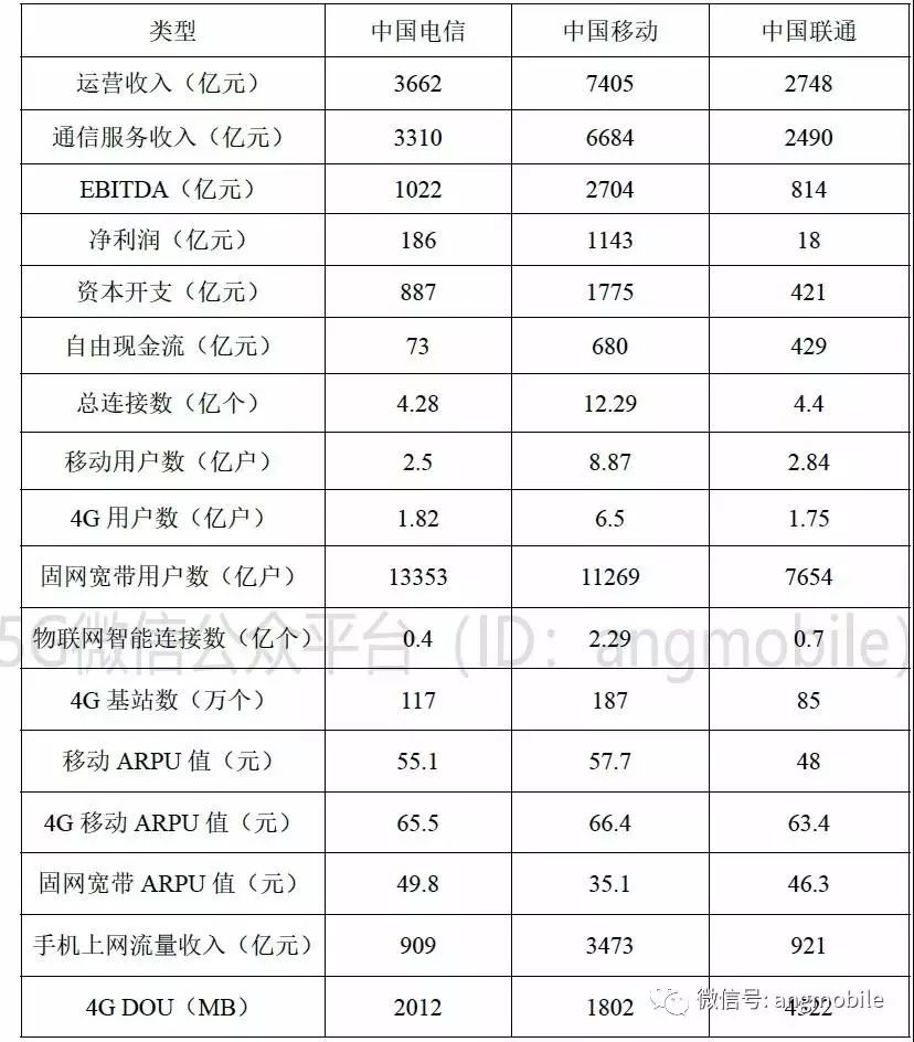 随着中国电信在3月28日发布其2017年业绩报告,国内三大运营商在2017年的运营数据就全部齐全了,汇总如下,供大家参考。