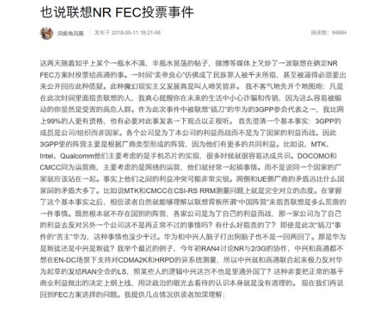 华为3GPP参会代表发文联想NR FEC投票事件不要过分炒作