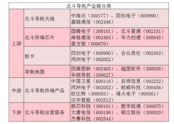 产业链上游包括基础产品、基础软件和基础数据。其中基础产品中又包括天线、芯片和板卡;中游主要分为系统集成和终端集成;下游为运营服务。如下图所示上中下游企业分类: