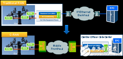 C-RAN成为了最受瞩目的新架构。C-RAN架构中,移动基带处理设备(以及相关的空调及电源设备)迁出了基站,而迁入了邻近的局端或数据中心。参看图1。