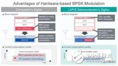 2. 业界首款用于Sigfox的BPSK(Binary Phase Shift Keying,二进制相移键控)调制电路硬件化,有助于应用实现更低功耗Sigfox使用以往的sub-GHz通信中未采用的BPSK调制方式。然而,由于以往支持标准Sigfox的LSIs不支持BPSK调制,所以有必要通过微控制器(MCU)软件创建BPSK的符号数据。而这种方法在每次进行无线通信时,都必须驱动微控制器,产生不必要的功耗。而ML7404不仅支持Sigfox,还将BPSK调制电路硬件化。这样,微控制器在无线通信工作过程中无需再涉及无线通信的物理层,可使通信系统实现更低功耗。