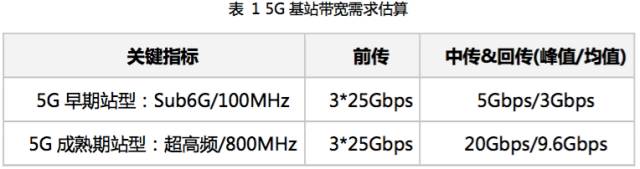由于采用高频段、更宽频谱和新空口技术,5G基站带宽需求大幅提升,预计将达到LTE的10倍以上。下表为典型的5G单个S111基站的带宽需求估算: