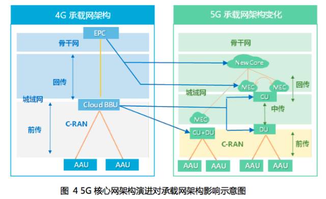 这样,RAN分离后,承载网也就分成了三个部分:前传、中传和回传。