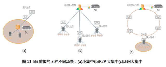 5G前传分为3种不同场景:(a)小集中、(b)P2P大集中、(c)环网大集中。
