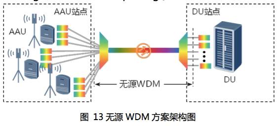 无源波分方案采用波分复用(WDM)技术,将彩光模块安装在无线设备 (AAU 和DU)上,通过无源的合、分波板卡或设备完成WDM功能,利用一对甚至一根光纤可以提供多个AAU到DU之间的连接,如下图所示。