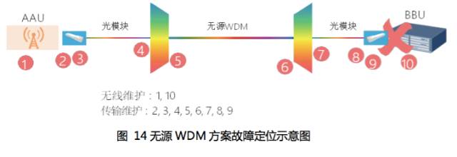 无源WDM方案出了故障后,难以具体定界出问题的责任方。下图所示为无源波分方案的故障定位示意图,可见其故障定位的复杂度。