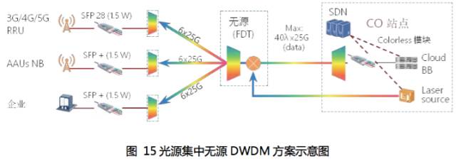 为了适应5G承载的需求,基于可调谐波长的无源DWDM方案是一种可行方案,另外基于远端集中光源的新型无源DWDM方案也成为业界研究的一个热点, 其原理如下图所示。该方案在降低成本、特别是接入侧成本和提高性能和维护便利性方面具有一定的优势。