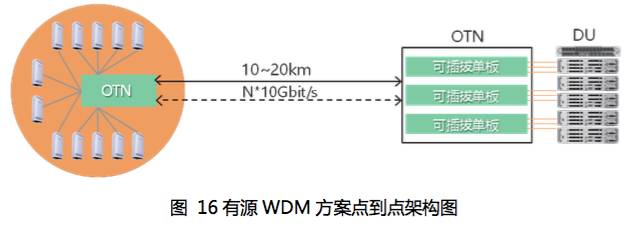 有源波分方案在AAU站点和DU机房配置城域接入型WDM/OTN设备,多个前传信号通过WDM技术共纤光纤资源,通过OTN开销实现管理和保护,提供质量保证。