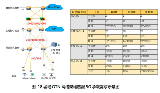 城域OTN网络架构与5G中传/回传的承载需求是匹配的,其中骨干层/汇聚层与5G回传网络对应,接入层则与中传/前传对应。