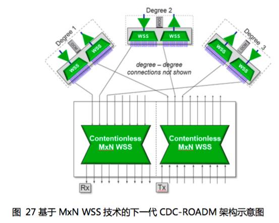 随着ROADM技术的持续演进,下一代ROADM将朝着更高维度、简化运维的方向发展,基于MCS技术的WSS由于分光比太大,需要采用光放大器阵列进行补偿,其未来演进受到限制,尤其是难以向更高维度发展。MxN WSS技术是一个重要的发展方向。