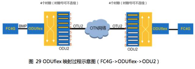下图中映射路径为:FC4G->ODUflex->ODU2;其中,ODUflex映射到ODU2中4个时隙,剩余时隙可用来承载其他业务,带宽利用率可达100%。