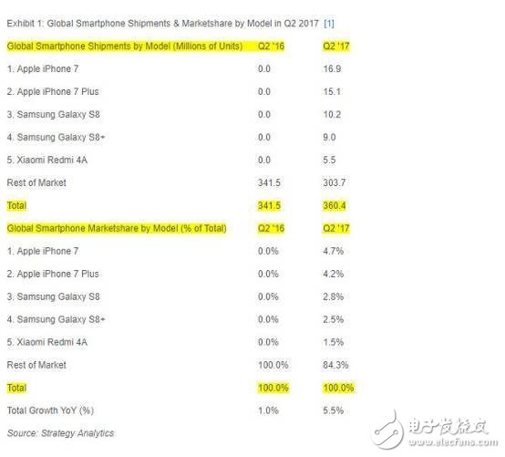根据来自Strategy Analytics的统计结果显示,二季度苹果iPhone 7的全球销量为1690万部,而5.5英寸的iPhone 7 Plus销量为1510万部,出货量占比分别达到了全球总出货量的5%和4%,排名第一和第二。