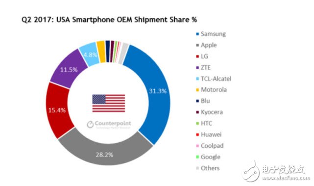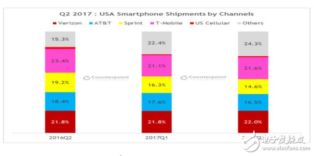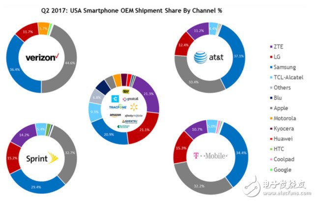 二季度美国智能手机各品牌在不同渠道的销售占比