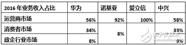 可以看出,在公司整体业务收入上,四大通信厂商在2016年的表现和排名相对2015年变化并不大: