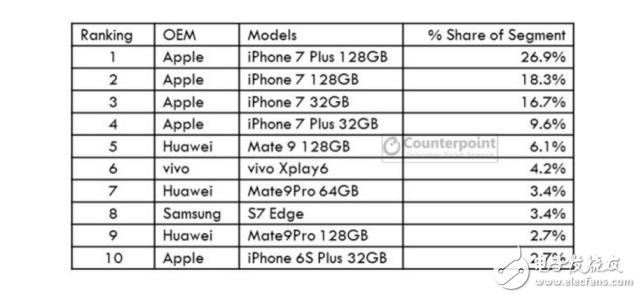 Counterpoint的数据显示,今年第一季苹果iPhone 7系列的四个型号占据高端市场销量前四名,它们合计吃掉了71.5%的份额,而整体份额排在第二的华为Mate 9系列,则只有12.2%的占有率。去年的全球安卓机销量冠军三星S7 Edge,在中国高端机市场则只有3.4%的份额。