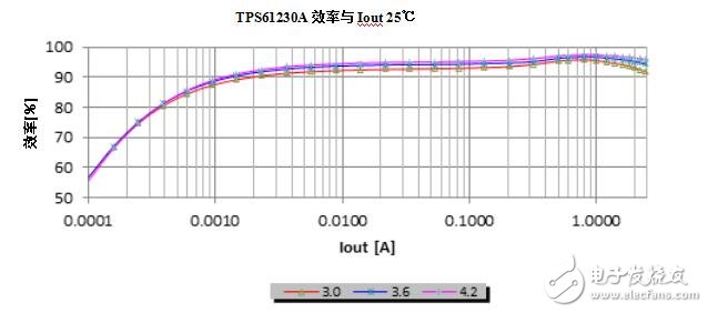图4所示为不同输入电压的效率曲线。在VOUT = 5V和VIN = 3.6V时,TPS61230A具有3A的出色输出容量;效率可高达94%。