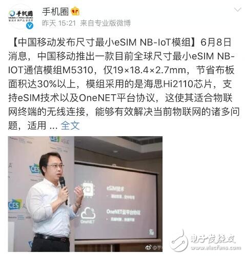 6月7日,在2017CES Asia(亚洲消费电子展)上,中国移动推出了目前全球尺寸最小eSIM NB-IOT通信模组M5310。除此之外,中国移动还展示了智能单车锁、智能车载后视镜以及中国移动自主研发的物联网开放平台OneNET等产品。