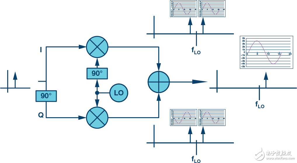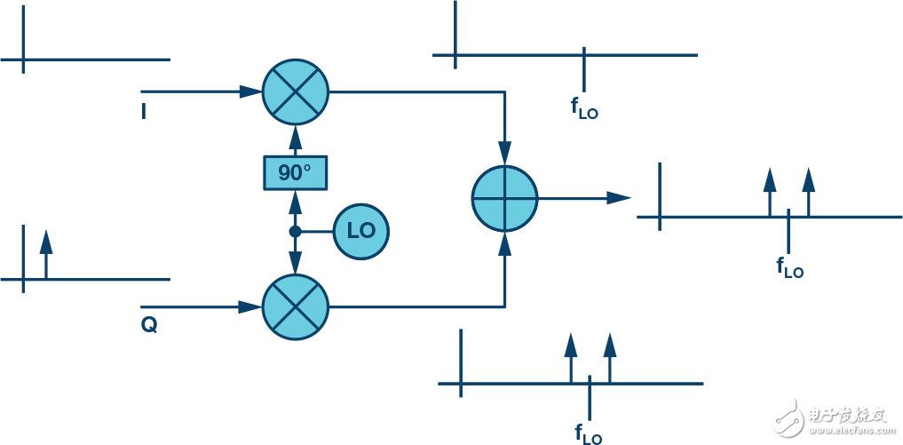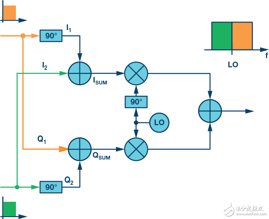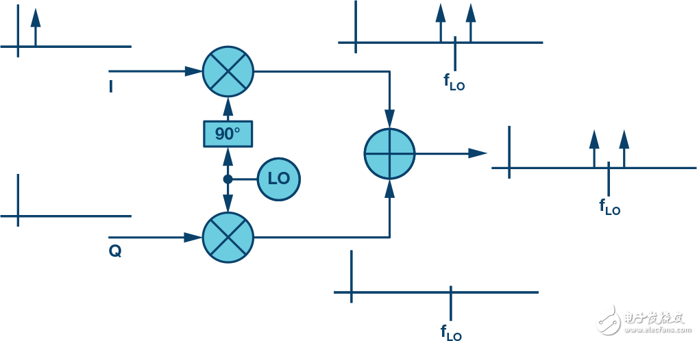 回到图5所示的复数混频器,我们知道其架构消除了镜像而无需外部滤波。而且,在零中频架构中可以优化效率,使得信号路径处理带宽等于所需信号带宽。图7所示的概念图说明了其实现原理。如上所述,如果I比Q超前90°,则仅LO上侧会有输出。如果Q比I超前90°,则仅LO下侧会有输出。因此,如果产生两个独立基带信号,其中一个设计成仅产生上边带输出,另一个设计成仅产生下边带另一个设计成仅产生下边带输出,那么可以在基带中将其相加并施加于复数发射机。结果将是具有不同信号的输出出现在LO上侧和下侧。在实际应用中,组合基带信号以数字方式产生。图7所示求和节点仅是为了说明此概念。