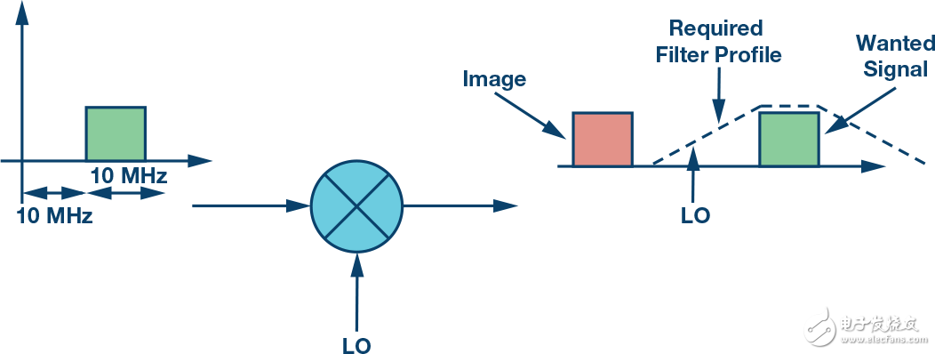 镜像和所需信号之间的间隔会直接影响到对滤波器的要求。如果间隔较大,可以使用滚降较缓的简单低成本滤波器。如果间隔较窄,设计必须实现具有陡峭响应的滤波器,通常采用多极点或SAW滤波器。因此可以说,镜像和所需信号之间必须保持适当的间隔,以便可以滤除镜像而不影响所需信号;该间隔与滤波器的复杂度和成本成反比。此外,如果LO频率可变,滤波器必须可调谐,这会进一步增加滤波器的复杂度。
