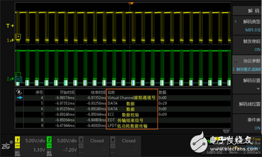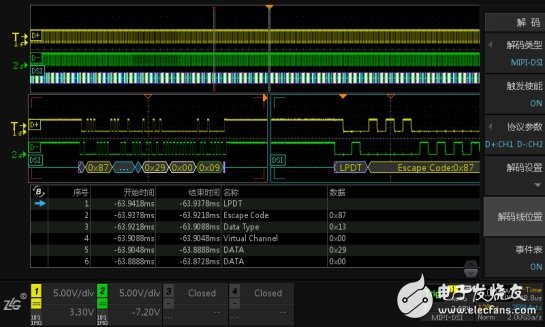 (2) ZDS4054 Plus标配512Mpts的存储深度,且可对全内存数据进行解码,MIPI-DSI协议解码界面如图8所示。可通过事件表查看具体的解码内容,也可以将事件表中的内容通过导出报表的格式将其导出。