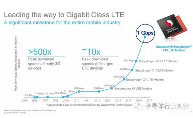 高通表示,X16能够提供的最高下载速度,能够让用户有“像光纤一样”的体验,与高通的第一代LTE设备相比,X16在速度上有了10倍的提升。