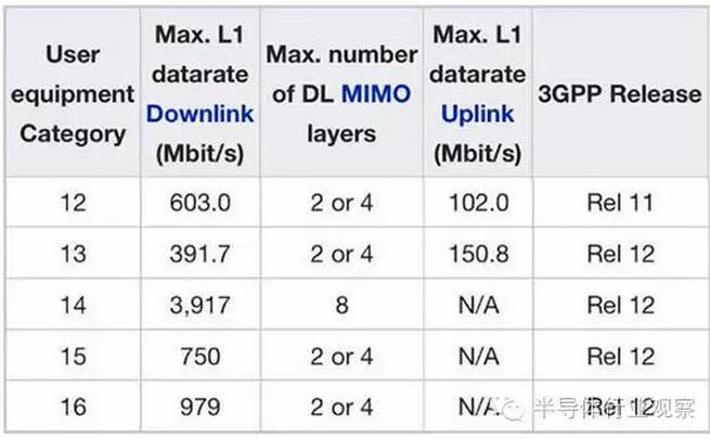 3GPP对LTE Cat的相关定义(source:维基百科)