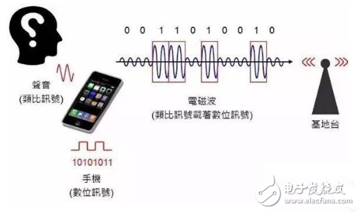 现在的手机是属于“数码通讯”,也就是我们讲话的声音(连续的类比讯号),先由手机转换成不连续的0与1两种数码讯号,再经由数码调变转换成电磁波(类比讯号载着数码讯号),最后从天线传送出去,原理如图所示。