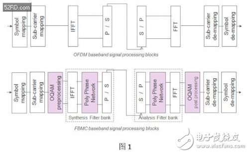 图1所示为FBMC与OFDM在实现上的区别。FBMC主要包括符号映射,子载波映射,OQAM处理,IFFT,滤波器组处理,并串行转换等过程,与OFDM比较主要区别就在于OQAM和滤波器组处理。