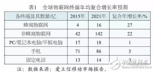 今年来,互联网终端的数量迅速逼近饱和。在新应用的推动下,预计到2017年互联网终端的数量将被物联网终端超越,到2021年,物联网终端数量将迅速达到互联网终端的2倍以上,如图1所示。