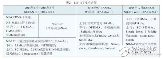 2014年5月,在GERAN组“FS_IoT_LC”的研究项目中,主要由3项技术被提出,分别是拓展覆盖GSM技术、NB-CIoT技术和NB-LTE技术。其中,NB-CIoT由华为、高通和Neul联合提出。做种,在2015年9月的RAN#69次全会上协商同意为NB-IoT技术。NB-IoT进展如表2,所示。