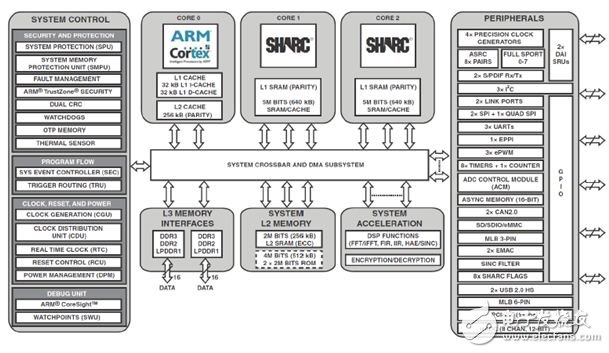 陆磊强调,之所以采用硬件加速单元,是因为需要支持FTI、iFFT、FIR、 IIR,电力应用时需要做谐波分析,电机控制的时候做SINC滤波,这些运算量非常大,通过硬件加速可增强整体芯片的处理能力,以FFT性能来看可以支持最高18GFLOPS的浮点运算能力,相比较5.4G SHARC+的运算能力而言,速度能效是其10倍,功耗更低。此外,在进行加密运算的时候也会消耗很大的内存,如果也是采用SHARC+的处理器核心来做的话很不经济,用硬件加速的方式既能够实现安全性,同时也保证了整体的性能没有损失。