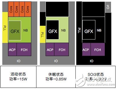 AMD 最新的APU中集成的另一项功能是围绕处理器运行时进入极低功耗的S0i3状态。该低功耗状态的采用因不同的OEM/平台而异(即可以是联网待机、 现代待机或挂起到内存),但是这种状态会让差不多所有的APU硅片的电源关断,同时让所有相关的I/O器件也进入各自的低功耗状态,从而极大地降低平台的 功耗。图中展示了在这些条件下APU的电源关断。S0i3状态使平台的功耗水平能够与传统的S3状态(也就是传统上所说的“待机”)相当—S3状态的进入 和退出会比较耗时,因为它需要操作系统介入。通过动态实现这个过程,在集成电源管理微控制器的控制下,假如系统活动水平足够低,APU就可以以亚秒级的时 间帧透明实现与待机相当的功耗水平。这直接意味着可以降低典型应用条件下的平均功耗。