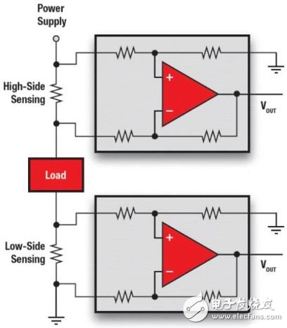 电流分流器监控集成电路,同时也叫电流检测放大器,精确测量待测电阻两端的微小电压。防止检测放大器干扰被测电压,这些集成电路具有很高的输入阻抗。然而,在选择并联显示器之前,必须做出一个明智的决定,那就是是否要将电流检测电阻放置在负载的电源电压轨上(高边监控)。或者负载的地面点(低边监控),每一种都有其优点和缺点。