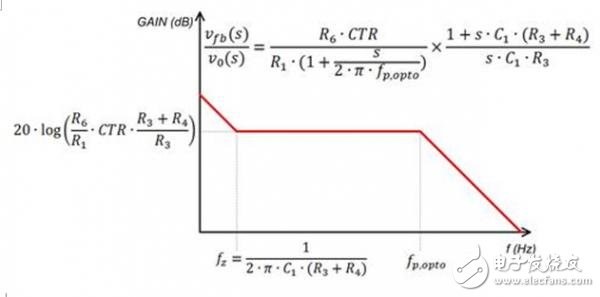 首先,让我们考虑一下简单的积分电路是什幺样子。要实现这一点,我们只需在自己的电路中将R4设置成零欧姆。所得的传递函数和增益坐标图(从“输出电压”到 “反馈”)如图2所示。有趣的是,我们有一个DC极点和一个由R3和C1形成的零点。由于内部环路的存在,零点有些反直观。频率高于这个零点时,增益只等于两个电阻器(R6和R1)的比乘以光电耦合器的电流传输比(CTR)。频率在10kHz以上时,光电耦合器带宽会产生了一个可限制增益的极点。