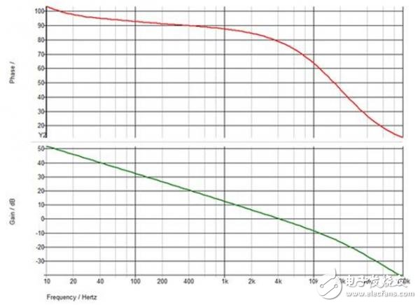 作为一个实际的例子,请考虑一下具有220uF输出电容器的电流模式12V/12W反激式电路,其中设备具有最大负载时的增益和相位特点(图4)。该坐标图对应的是从反馈节点到电源输出端的传递函数。在这个系统中,我们所用光耦合器的CTR大约为1,而R1和R6均为1kΩ。因此,用算式CTR* (R6/R1)计算出的有效增益为0dB,而且在这个例子中,这些参数对补偿增益没有影响。