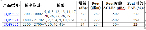 TQP9309、TQP9321和TQP9326产品系列涵盖了700 - 2700 MHz频率范围内的所有主要3GPP频段。事实上,每种产品可在很宽的工作频率范围内提供27 dBm以上的输出功率,可用于多个频段,适合全球不同地区。