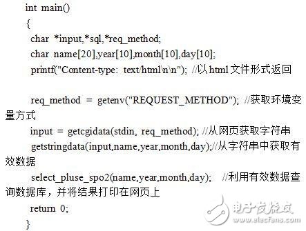 select_pluse_spo2()函数以getstringdata()函数得到的有效信息为参数,执行打开数据库、查询数据、向网页打印数据操作。部分功能实现代码: