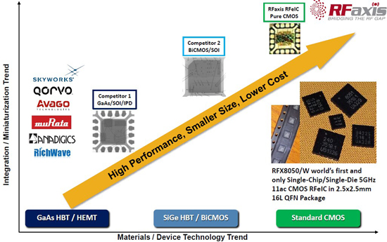RFaxis 纯CMOS RF方案与竞争对手的GaAs和BiCMOS方案相比,在更小封装尺寸,更低功耗和高性能上表现出色。