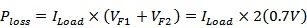 当二极体1和3正向偏置时,二极体2和4反向偏置,反之亦然。因此,整流桥的主要功率损耗就是两个二极体上的正向压降。标準二极体的压降约为0.7 V。这表示两个二极体的功率损耗为:
