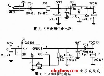 采用12C5A60S2单片机和SIM300无线通信模块构成数据采集终端。外部输入电压为9 V,由于传感器及单片机工作电压为5 V,而SIM300模块工作电压为4.2 V,因此本系统需提供5 V及4.2 V电压。5 V电源可由7805芯片实现;而对于SIM300模块采用4.2 V供电,工作时要求电源最高输出电流必须达到2 A,因此采用MIC29302芯片,电路图分别如图2,图3所示。