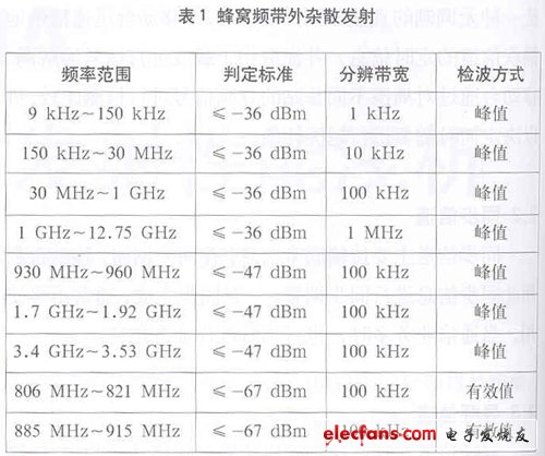对于869 MHz~894 MHz之外的频率,杂散发射指标如表1所示。