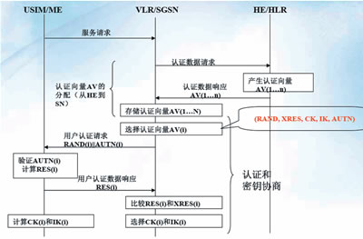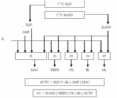 3GUMTS系统的双向认证、加密和完整性保护是基于(RAND,XRES,CK, IK, AUTN)五元组实现的,基本过程如下。