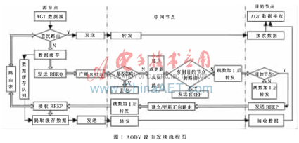 AODV是Ad-hoc网络的经典路由协议,它是由路由发现和路由维护组成。路由发现过程如图1所示。而在路由维护中,节点通过周期性地发送HELLO包维持与邻居节点的连接,若一段时间后还未收到邻居节点的HELLO包,则开始链路修复过程。若本节点离目的节点较近,则进行本地修复,发送RREQ进行路由重建,当中间节点有到不可达节点的有效路由或者不可达节点收到此RREQ后就发送一个路由回复RREP给源节点,这样路由就得到了重建。若链路修复失败,则节点向所有的邻居节点广播RERR包,RERR包中的不可达节点列表不仅包括了链路断开的邻居节点,还包括了以此邻居节点作为下一跳的所有目的节点。通过RERR的广播,其他节点便知道链路断开了,当此包传到源节点时,将进行新一轮的路由发现。