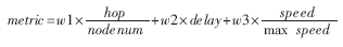 其中hop代表跳数,nodenum表示网络总的节点数,delay代表上一跳节点到本节点的延迟,speed代表本节点的移动速度,max speed代表网络中节点的最大移动速度,w1、w2和w3分别代表权值,其中,w1+w2+w3=1,本协议中w1、w2和w3的值分别取为0.7、0.2和0.1。当metric的值越小,路由链路的稳定度越高,网络延迟越小。