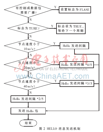 IMAODV中对HELLO消息做两方面改进: (1)是为HELLO消息设置了一个标志。初始化为TURE,节点发送HELLO消息,当节点有路由或数据信息需要广播时,标志设为FALSE。如果HELLO发送周期再次到来,先检查标志,如果为FALSE,则改变状态为TURE后不作任何处理,直至下一个周期的到来,再继续检查标志;当标志为TURE时,则发送HELLO消息,同时每个节点在接收路由包或是数据包的时候,要更新邻居的生存时间,这样可以降低发送HELLO消息的开销。(2)由于节点的移动,会造成网络拓扑的变化,HELLO消息的固定发送肯定不能有效地捕捉到网络拓扑信息,为了保证链路的有效性,本文将根据节点自身的速度来调节HELLO包的发送频率,发送频率与节点的移动速度成正比,流程如图2所示。